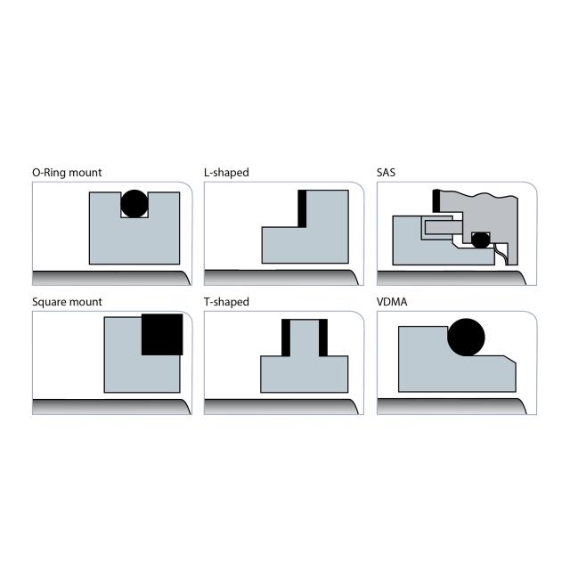 732 - O-Ring Mount 755 - O-Ring Mount, Slotted 773 - O-Ring Mount 782 - O-Ring Mount 414 - T-shaped 725 - Square Mount 714 - L-shaped 723 - L-shaped, Small OD 777 - L-shaped, ISO VDMA - DIN O-Ring Mount SAS - Self-Aligning Stationary |