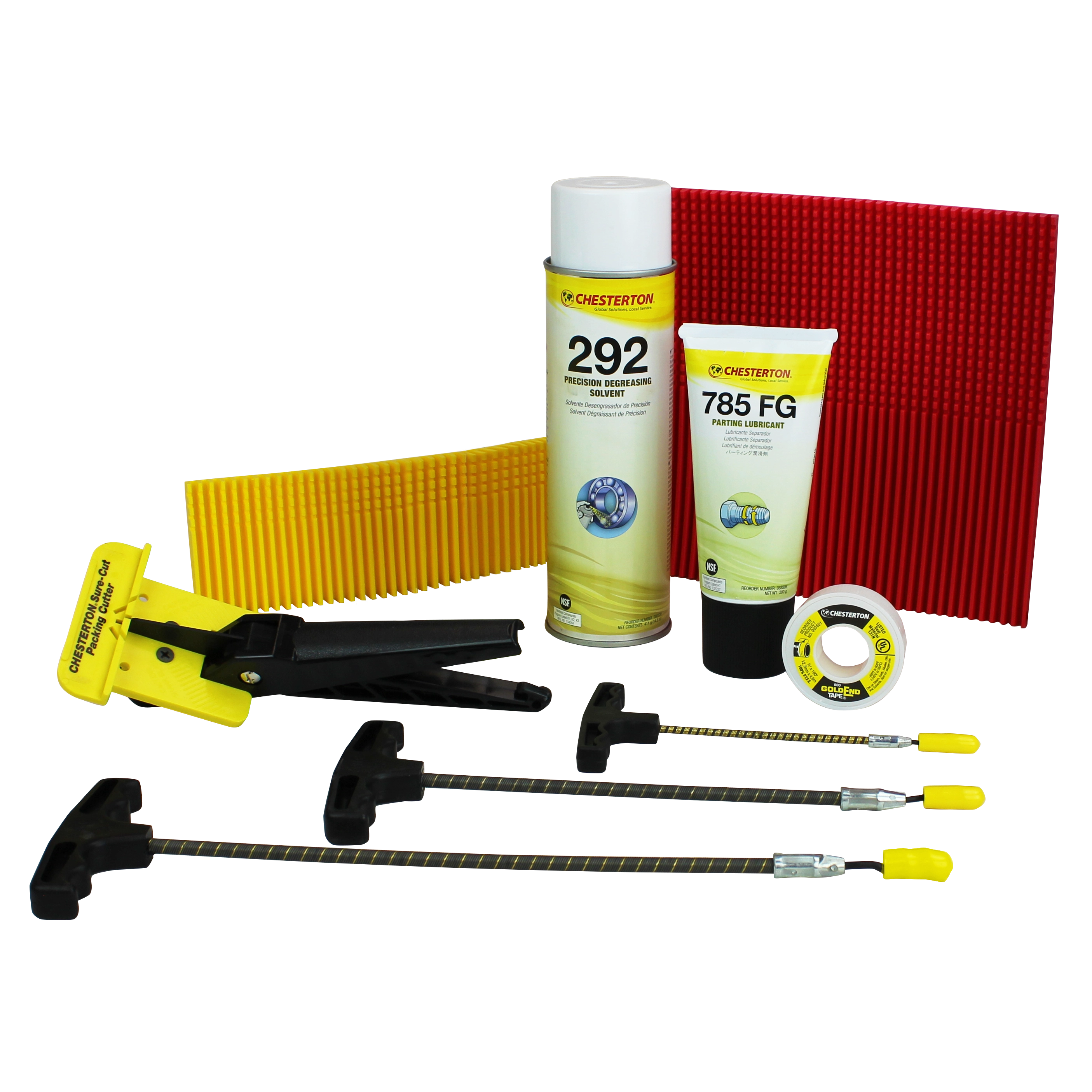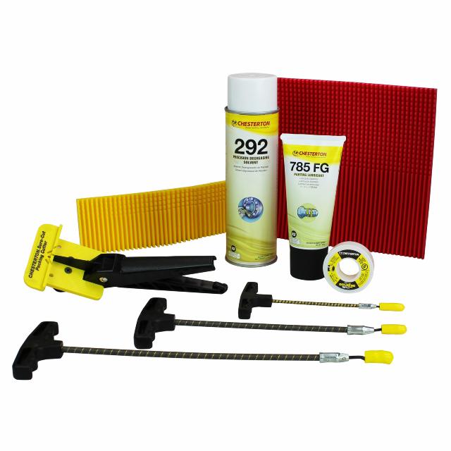The kit includes the Sure-Cut® Packing Cutter, a safety-focused knife designed to meet strict plant requirements. You'll also find Flexible Packing Extractors with ergonomically form-fitting handles that make removing old packing rings easy, even in tight spaces. The Pump and Valve Tamping Tools offer multiple cross-sectional packing sizes for a perfect fit. Additionally, it features essential Chesterton maintenance products: 292 Precision Degreaser for precise component cleaning, 785 FG Parting Lube to ensure smooth assembly and disassembly, and 800 GoldEnd® PTFE Tape for confident sealing of threaded connections.