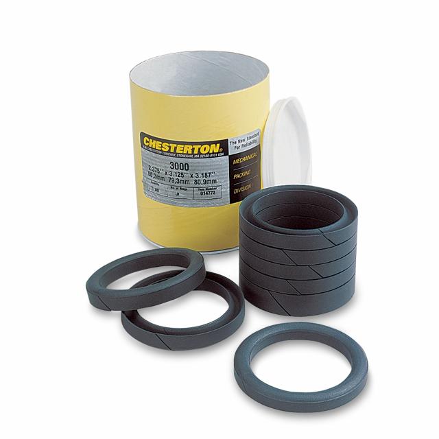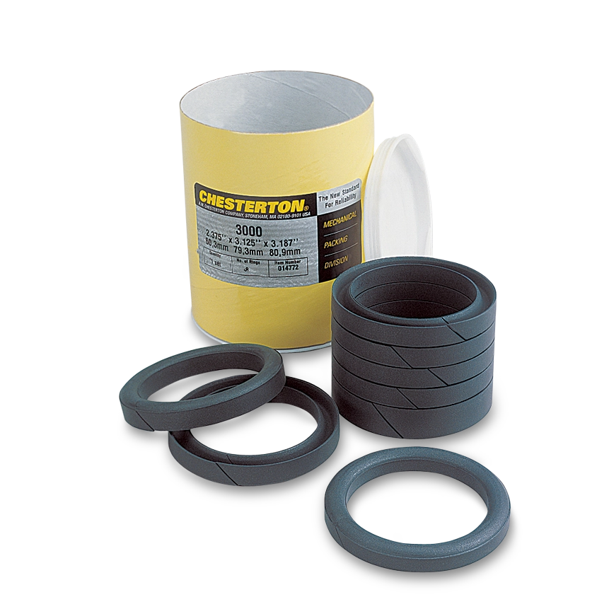 Chesterton 3000 Sootblower Sets are molded from an exclusive mixture containing graphite and PTFE along with other materials. 3000 sets are designed with a thicker than usual top ring to act as a bearing for the set and to resist extrusion. All rings are split to go over the rod without being deformed. Exclusive Chesterton formulation and processing allow rings to slip over rod and return to their molded contour without cracking.