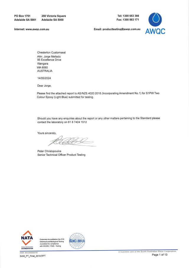 Certification: ARC S1PW Light Blue Potable Water AS NZS 4020 2018