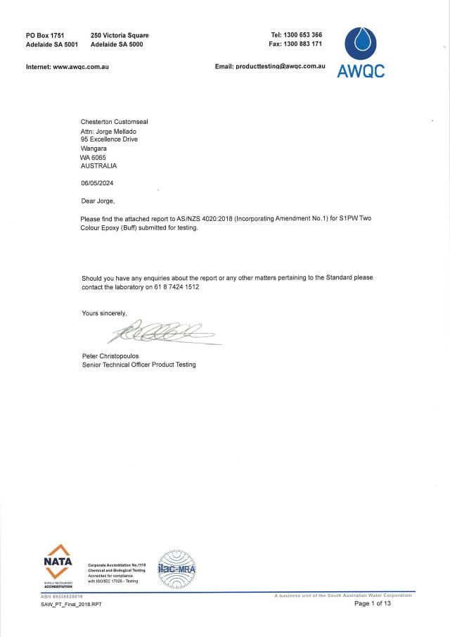 Certification: ARC S1PW White Potable Water AS NZS 4020 2018