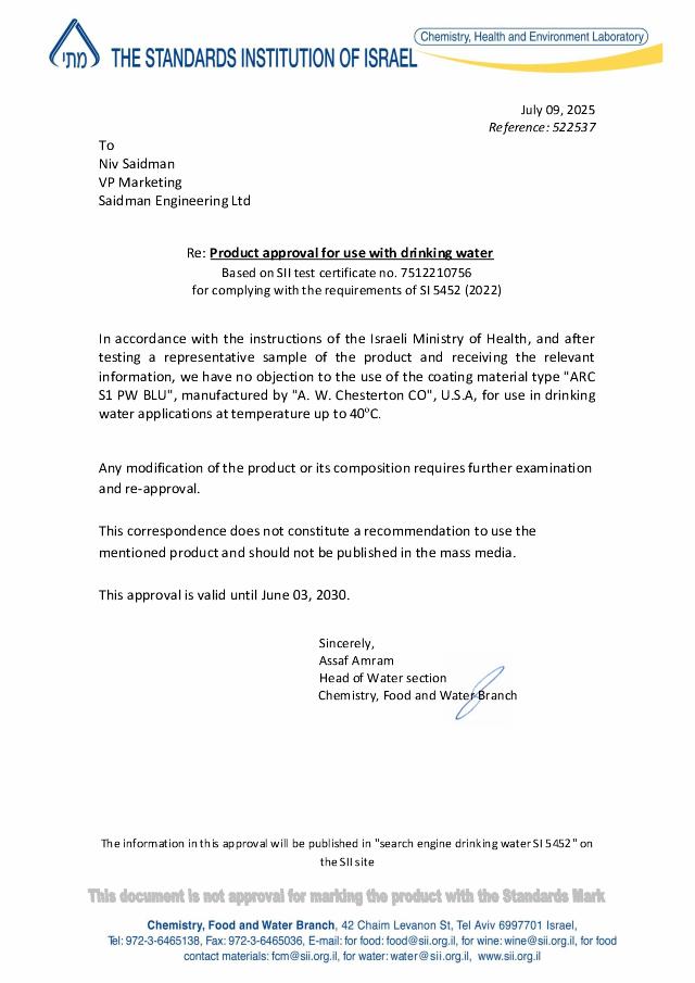 Certification: The Standards Institute of Israel Approval - ARC S1PW