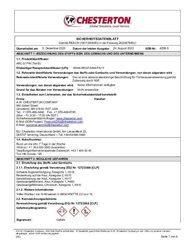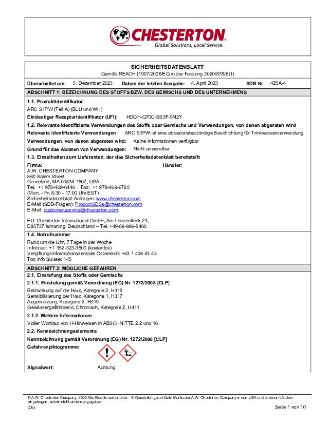 Certification: ARC S1PW Approved for Food Contact (Deutsch)