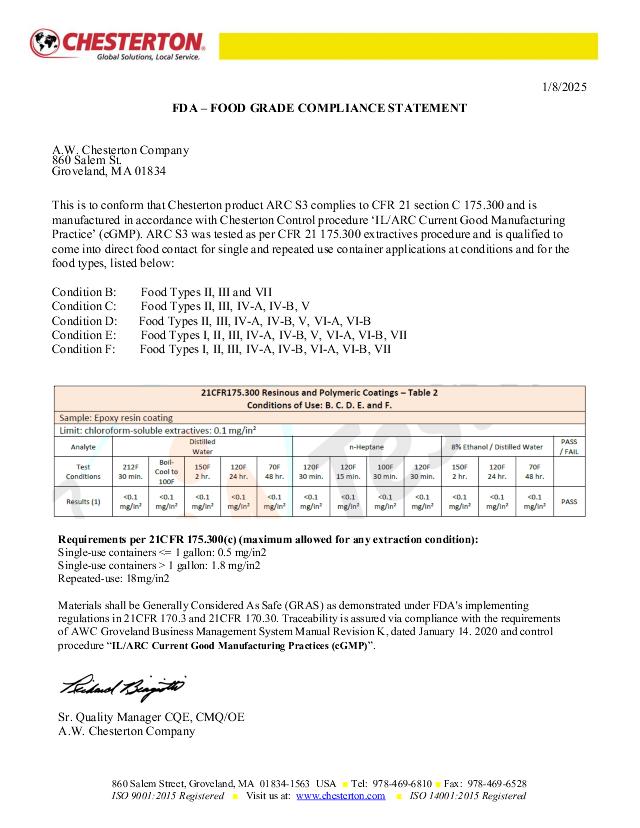 Certifcation: FDA – Food Grade Compliance Statement ARC S3 (English)